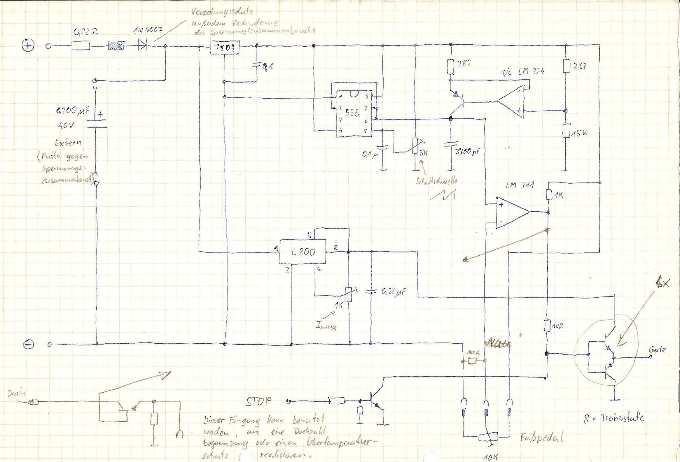 Mittels eines NE555 zur Takterzeugung und Takterzeugung und einer Konstantspannungsquelle wird ein Sägezahnsignal erzeugt. Das Gaspedal verschiebt einen Schwellwert, der über einen analogen Komparator mit der Sägezahnspannung verglichen wird. Der Komparatorausgang erzeugt somit ein Rechtecksignal, dessen Tastverhältnis proportional zur Pedalstellung ist.
